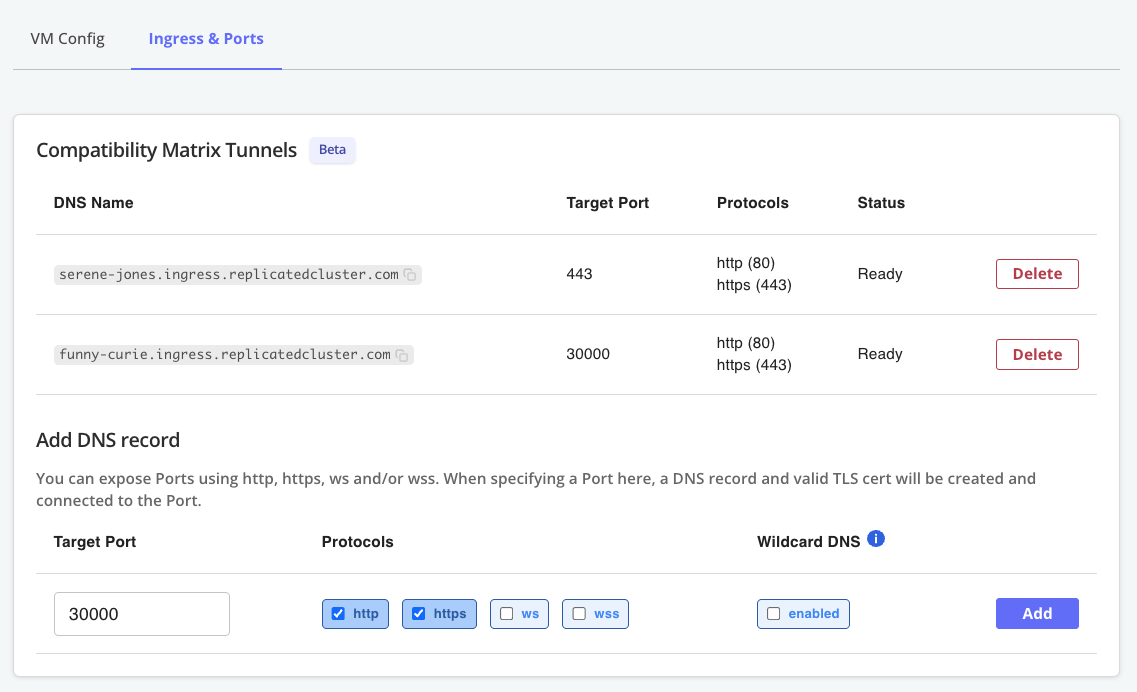 If you created the VM with Compatibility Matrix, enter the URL that you copied for the DNS record with a target port of 443. For example,